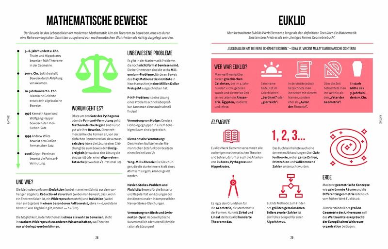Auf einen Blick - Mathematik vereint alle entscheidenden mathematischen Theorien und Entdeckungen in einem kompakten Band. Jede Seite enthält einen "Spickzettel", der Ihnen die wichtigsten Fakten mundgerecht erklärt, sodass Sie im Handumdrehen zum Experten werden. Von Null bis zur Riemannschen Vermutung, von Primzahlen bis zu irrationalen Zahlen und von Pythagoras bis zu John Nash und Roger Penrose wird jeder Akteur, jede Theorie oder jeder Begriff in prägnantem Text und anschaulichen Grafiken erklärt. Perfekt für Wissenshungrige und Zeitarme, macht diese Sammlung von grafisch aufbereiteten Einheiten Mathematik interessant und zugänglich. Alles, was Sie wissen müssen, finden Sie hier.