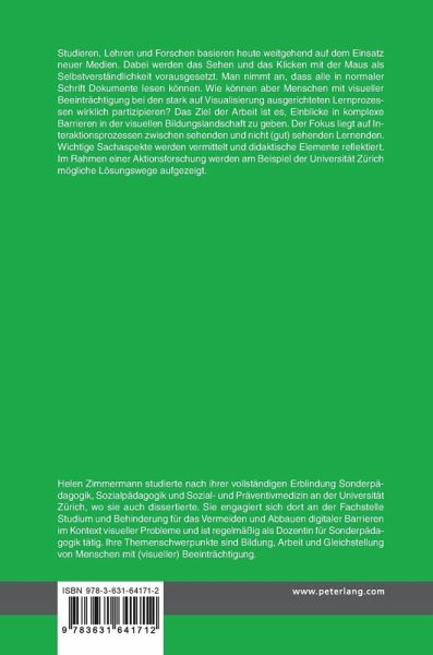 Studieren, Lehren und Forschen basieren heute weitgehend auf dem Einsatz neuer Medien. Dabei werden das Sehen und das Klicken mit der Maus als Selbstverständlichkeit vorausgesetzt. Man nimmt an, dass alle in normaler Schrift Dokumente lesen können. Wie können aber Menschen mit visueller Beeinträchtigung bei den stark auf Visualisierung ausgerichteten Lernprozessen wirklich partizipieren? Das Ziel der Arbeit ist es, Einblicke in komplexe Barrieren in der visuellen Bildungslandschaft zu geben. Der Fokus liegt auf Interaktionsprozessen zwischen sehenden und nicht (gut) sehenden Lernenden. Wichtige Sachaspekte werden vermittelt und didaktische Elemente reflektiert. Im Rahmen einer Aktionsforschung werden am Beispiel der Universität Zürich mögliche Lösungswege aufgezeigt.