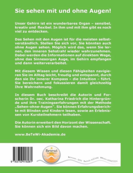Sie sehen mit und ohne Augen! Unser Gehirn ist ein wunderbares Organ - sensibel, kreativ und flexibel. In ihm und mit ihm gibt es noch viel zu entdecken.Das Sehen mit den Augen ist für die meisten selbstverständlich. Stellen Sie sich vor, Sie könnten auch ohne Augen sehen. Möglich wird das, wenn Sie lernen, den inneren Sehstrahl wieder wahrzunehmen. Dabei werden die Informationen auf direktem Wege, ohne das Sinnesorgan Auge, im Gehirn empfangen und dann weiterverarbeitet. Mit diesem Wissen und diesen Fähigkeiten navigieren Sie im Alltag leicht, freudig und entspannt, durch den sie Ihr innerer Kompass - die Intuition - führt. Sie bereichern und fokussieren damit gleichzeitig Ihre Wahrnehmung. In diesem Buch beschreibt die Autorin und Forscherin Dr. oec. Katharina Friedrich die Hintergründe und ihre Trainingserfahrungen mit der Methode "Sehen ohne Augen". Sie können Erfahrungsberichte mit Blinden und Kindern lesen, sowie an Erlebnissen von Kursteilnehmern teilhaben.Katharina Friedrich erweitert den Horizont der Wissenschaft. Sie können sich ein Bild davon machen.