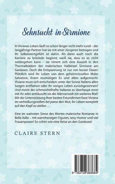 In Vivianes Leben läuft es schon länger nicht mehr rund - der langjährige Partner hat sie mit einer Jüngeren betrogen und ihr Selbstwertgefühl ist dahin. Als dann auch noch die Karriere zu bröckeln beginnt, weiß sie, dass es so nicht weitergehen kann - sie nimmt sich eine Auszeit in den Thermalbädern der malerischen Halbinsel Sirmione am Gardasee. Doch die Entspannung ist nur von kurzer Dauer: Plötzlich wird ihr Leben von dem geheimnisvollen Maler Salvatore, ihrem reumütigen Ex und alten Familiengeschichten aufgemischt. Viviane muss sich entscheiden: unter der Sonne Italiens allen Sorgen entfliehen oder ihr voriges Leben zurückgewinnen? Und meint der schmeichelhafte Italiener es überhaupt ernst mit ihr oder enttäuscht sie die Männerwelt ein weiteres Mal? Mit der Unterstützung ihrer besten Freundinnen fasst Viviane im verheißungsvollen bel paese den Mut, ihr Leben komplett auf den Kopf zu stellen...Eine im wahrsten Sinne des Wortes malerische Romanze in Bella Italia - mit warmherzigen Figuren, sexy Humor und viel Frauenpower! So schön wie eine Reise an den Gardasee!