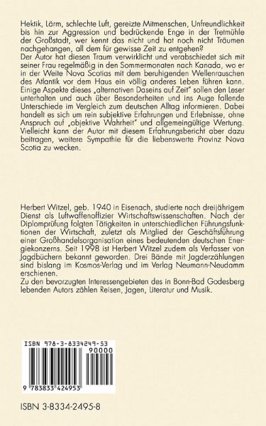 Hektik, Lärm, schlechte Luft, gereizte Mitmenschen, Unfreundlichkeit bis hin zur Aggression und bedrückende Enge in der Tretmühle der Großstadt, wer kennt das nicht und hat noch nicht Träumen nachgehangen, all dem für gewisse Zeit zu entgehen?Der Autor hat diesen Traum verwirklicht und verabschiedet sich mit seiner Frau regelmäßig in den Sommermonaten nach Kanada, wo er in der Weite Nova Scotias mit dem beruhigenden Wellenrauschen des Atlantik vor dem Haus ein völlig anderes Leben führen kann. Einige Aspekte dieses "alternativen Daseins auf Zeit" sollen den Leser unterhalten und auch über Besonderheiten und ins Auge fallende Unterschiede im Vergleich zum deutschen Alltag informieren. Dabei handelt es sich um rein subjektive Erfahrungen und Erlebnisse, ohne Anspruch auf "objektive Wahrheit" und allgemeingültige Wertung. Vielleicht kann der Autor mit diesem Erfahrungsbericht aber dazu beitragen, weitere Sympathie für die liebenswerte Provinz Nova Scotia zu wecken.
