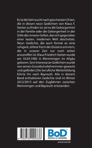Es ist die Sehnsucht nach geschützten Orten, die in diesen neun Gedichten von Klaus F. Stetter zu finden ist: sei es die Geborgenheit in der Familie oder die Geborgenheit in der Stille des inneren Selbst, das sich gegenüber einer lauten, modernen Welt abschottet. Neun Gedichte, die auch formal an eine ruhigere, stillere Form der Existenz erinnern, die in unserer Zeit nur noch selten anzutreffen ist.