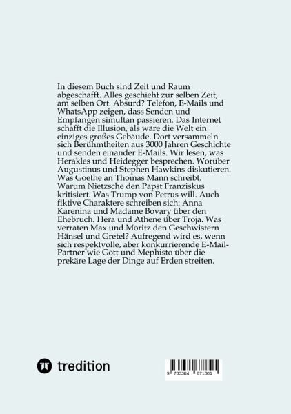 Was würde geschehen, wenn Zeit und Raum abgeschafft wären und alles zur selben Zeit und am selben Ort passierte? Keine völlig absurde Idee. Was mit dem Telefon begann, wird durch E-Mail, SMS und WhatsApp fortgesetzt. Wir senden und empfangen passieren (fast) gleichzeitig. Und das Internet schafft in Wort und Bild, mit Audio, Video und Streaming die Illusion, als säßen wir alle im selben großen Gebäude. Dort können sich berühmte Leute aus Vergangenheit und Gegenwart und bekannte Figuren aus Märchen und Mythen wie in einem imaginären zeitlosen Cyberspace versammeln und sich gegenseitig E-Mails schicken.Wir lesen mit: Wie Goethe in Weimar einen schmeichelnden Brief von Thomas Mann beantwortet. Was Herakles und Heidegger diskutieren. Was Nietzsche, kurzsichtig über seinem i-Pad gebeugt, aus Sils Maria an Papst Franziskus schreibt. Was Bach an Mozart lobt. Was Donald Trump vom Himmelspförtner Petrus will. Warum dann nicht auch fiktive Charaktere als Verfasser fingierter E-Mails teilnehmen lassen? Was haben sich Anna Karenina und Madame Bovary über den Ehebruch zu sagen? Was plaudern Hera und Athene über olympische Helden? Und wer wäre nicht neugierig, worüber die Brüder Max und Moritz mit den Geschwistern Hänsel und Gretel schwätzen? Richtig aufregend wird es, wenn sich respektvolle aber konkurrierende E-Mail-Partner unterhalten, wie Gott und Mephisto, über die verzwickte Lage der Dinge auf Erden. (Dies Buch ist eine verbesserte und ergänzte Neuauflage des Buches "Hallo Herr Goethe".)