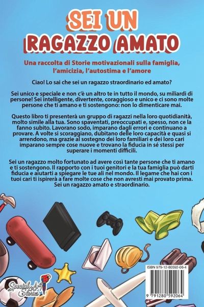 Ciao! Lo sai che sei un ragazzo straordinario ed amato? Sei unico e speciale e non c'è un altro te in tutto il mondo, su miliardi di persone! Sei intelligente, divertente, coraggioso e unico e ci sono molte persone che ti amano e ti sostengono: non lo dimenticare mai. Questo libro ti presenterà un gruppo di ragazzi nella loro quotidianità, molto simile alla tua. Sono spaventati, preoccupati e, spesso, non ce la fanno subito. Lavorano sodo, imparano dagli errori e continuano a provare. A volte si scoraggiano, dubitano delle loro capacità e quasi si arrendono, ma grazie al sostegno dei loro familiari e dei loro cari imparano sempre cose nuove e trovano la fiducia in sé stessi per superare i momenti difficili. Sei un ragazzo molto fortunato ad avere così tante persone che ti amano e ti sostengono. Il rapporto con i tuoi genitori e la tua famiglia può darti fiducia e aiutarti a spiegare le tue ali nel mondo. Il legame che hai con i tuoi cari ti ispirerà a fare molte cose che non avresti mai provato prima. Sei un ragazzo amato e straordinario. Cosa troverai in questo libro: 10 Storie ispiratrici per ragazzi sulla famiglia, l'amicizia, l'autostima e l'amore. Uno stile di scrittura semplice ed accattivante adatto sia alla lettura condivisa che a quella indipendente Identificazione con i personaggi, che sono sempre combinati con temi della vita reale dei bambini Belle Immagini per accompagnare la lettura e stimolare l'immaginazione Morali e Messaggi di Vita con riflessioni e coinvolgimenti nella narrazione I ragazzi amano questo libro perché li aiuta a: Capire l'importanza delle relazioni con i genitori e gli amici Sviluppare la fiducia in sé stessi e nelle proprie capacità Affrontare meglio le situazioni difficili Non arrendersi mai e non lasciarsi scoraggiare da piccoli fallimenti Essere curiosi e seguire le proprie passioni 2 Regali per te che puoi scaricare dal sito di Special Art: Diario dei sogni per bambini (PDF) Frasi motivazionali libro da colorare per bambini (PDF) Clicca su "compra ora" e aiuta un ragazzo a migliorare la sua autostima e a credere in se stesso! (Una Perfetta Idea Regalo)
