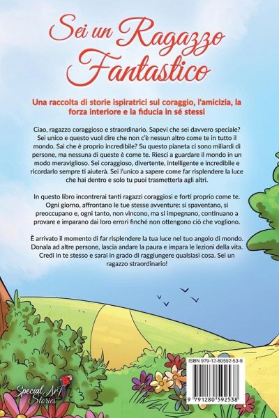 Ciao, ragazzo coraggioso e straordinario. Sapevi che sei davvero speciale? Sei unico e questo vuol dire che non c'è nessun altro come te in tutto il mondo. Sai che è proprio incredibile? Su questo pianeta ci sono miliardi di persone, ma nessuna di queste è come te. Riesci a guardare il mondo in un modo meraviglioso. Sei coraggioso, divertente, intelligente e incredibile e ricordarlo sempre ti aiuterà. Sei l'unico a sapere come far risplendere la luce che hai dentro e solo tu puoi trasmetterla agli altri. In questo libro incontrerai tanti ragazzi coraggiosi e forti proprio come te. Ogni giorno, affrontano le tue stesse avventure: si spaventano, si preoccupano e, ogni tanto, non vincono, ma si impegnano, continuano a provare e imparano dai loro errori finché non ottengono ciò che vogliono. È arrivato il momento di far risplendere la tua luce nel tuo angolo di mondo. Donala ad altre persone, lascia andare la paura e impara le lezioni della vita. Credi in te stesso e sarai in grado di raggiungere qualsiasi cosa. Sei un ragazzo straordinario! Cosa troverai in questo libro: 10 Storie ispiratrici per ragazzi sull' autostima, il coraggio, la forza interiore e l'amor proprio. Uno stile di scrittura semplice ed accattivante adatto sia alla lettura condivisa che a quella indipendente Identificazione con i personaggi, che sono sempre combinati con temi della vita reale dei bambini Belle Immagini per accompagnare la lettura e stimolare l'immaginazione Morali e Messaggi di Vita con riflessioni e coinvolgimenti nella narrazione I ragazzi amano questo libro perché li aiuta a: Sviluppare la fiducia in sé stessi e nelle proprie capacità Superare la timidezza e l'ansia Affrontare meglio le situazioni difficili Superare le paure ed essere coraggiosi Non arrendersi mai e non lasciarsi scoraggiare da piccoli fallimenti Credere nei propri sogni Capire l'importanza delle relazioni con i genitori e gli amici Essere curiosi e seguire le proprie passioni 2 Regali per te che puoi scaricare dal sito di Special Art: Diario dei sogni per bambini (PDF) Frasi motivazionali libro da colorare per bambini (PDF) Clicca su "compra ora" e aiuta un ragazzo a non smettere mai di sognare e a credere in se stesso! (Una Perfetta Idea Regalo)