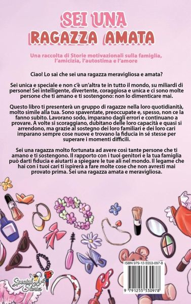 Ciao! Lo sai che sei una ragazza meravigliosa e amata? Sei unica e speciale e non c'è un'altra te in tutto il mondo, su miliardi di persone! Sei intelligente, divertente, coraggiosa e unica e ci sono molte persone che ti amano e ti sostengono: non lo dimenticare mai. Questo libro ti presenterà un gruppo di ragazze nella loro quotidianità, molto simile alla tua. Sono spaventate, preoccupate e, spesso, non ce la fanno subito. Lavorano sodo, imparano dagli errori e continuano a provare. A volte si scoraggiano, dubitano delle loro capacità e quasi si arrendono, ma grazie al sostegno dei loro familiari e dei loro cari imparano sempre cose nuove e trovano la fiducia in sé stesse per superare i momenti difficili. Sei una ragazza molto fortunata ad avere così tante persone che ti amano e ti sostengono. Il rapporto con i tuoi genitori e la tua famiglia può darti fiducia e aiutarti a spiegare le tue ali nel mondo. Il legame che hai con i tuoi cari ti ispirerà a fare molte cose che non avresti mai provato prima. Sei una ragazza amata e meravigliosa. Cosa troverai in questo libro: 10 Storie ispiratrici per ragazze sulla famiglia, l'amicizia, l'autostima e l'amore Uno stile di scrittura semplice ed accattivante adatto sia alla lettura condivisa che a quella indipendente Identificazione con i personaggi, che anche se immaginari, sono sempre combinati con temi della vita reale dei bambini Belle Immagini per accompagnare la lettura e stimolare l'immaginazione Morali e Messaggi di Vita con riflessioni e coinvolgimenti nella narrazione Le ragazze amano questo libro perché le aiuta a: Capire l'importanza delle relazioni con i genitori e gli amici Sviluppare la fiducia in sé stessi e nelle proprie capacità Affrontare meglio le situazioni difficili Non arrendersi mai e non lasciarsi scoraggiare da piccoli fallimenti Essere curiosi e seguire le proprie passioni 2 Regali per te che puoi scaricare dal sito di Special Art: Diario dei sogni per bambini (PDF) Frasi motivazionali libro da colorare per bambini (PDF) Clicca su ""compra ora"" e aiuta una ragazza a migliorare la sua autostima e a credere in se stessa! (Una Perfetta Idea Regalo)