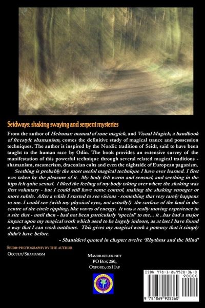 From the author of Helrunar: manual of rune magick, and Visual Magick, a handbook of freestyle shamanism, comes the definitive study of magical trance and possession techniques. The author is inspired by the Nordic tradition of Seidr, said to have been taught to the human race by Odin. The book provides an extensive survey of the manifestation of this powerful technique through several related magical traditions - shamanism, mesmerism, draconian cults and even the nightside of European paganism. Seething is probably the most useful magical technique I have ever learned. I first was taken by the pleasure of it. My body felt warm and sensual, and seething in the hips felt quite sexual. I liked the feeling of my body taking over where the shaking was first voluntary - but I could still have some control, making the shaking stronger or more subtle. After a while I started to see visions - something that very rarely happens to me. I could see (with my physical eyes, not astrally!) the surface of the land in the centre of the circle rippling, like waves of energy. It was a really moving experience in a site that - until then - had not been particularly 'special' to me... it ..has had a major impact upon my magical work which used to be largely indoors, as at last I have found a way that I can work outdoors. This gives my magical work a potency that it simply didn't have before. - Shantidevi quoted in chapter twelve 'Rhythms and the Mind'