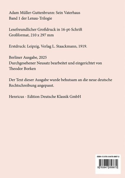 Adam Müller-Guttenbrunn: Sein Vaterhaus. Band 1 der Lenau-Trilogie Lesefreundlicher Großdruck in 16-pt-Schrift Großformat, 210 x 297 mm Berliner Ausgabe, 2025 Durchgesehener Neusatz bearbeitet und eingerichtet von Theodor Borken Erstdruck: Leipzig, Verlag L. Staackmann, 1919. Der Text dieser Ausgabe wurde behutsam an die neue deutsche Rechtschreibung angepasst. Umschlagabbildung: Nikolaus Lenau, Gemälde von Friedrich von Amerling Gesetzt aus der Minion Pro, 16 pt. Henricus - Edition Deutsche Klassik GmbH