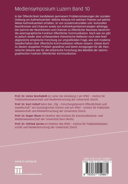 Prof. Dr. Kurt Imhof leitet den "fög - Forschungsbereich Öffentlichkeit und Gesellschaft" am Soziologischen Institut und am IPMZ - Institut für Publizistikwissenschaft und Medienforschung der Universität Zürich. Prof. Dr. Heinz Bonfadelli ist Leiter der Abteilung 2 am IPMZ - Institut für Publizistikwissenschaft und Medienforschung der Universität Zürich. Prof. Dr. Roger Blum ist Direktor des Instituts für Kommunikations- und Medienwissenschaft der Universität Bern (ikmb). Prof. Dr. Otfried Jarren ist Direktor des IPMZ - Institut für Publizistikwissenschaft und Medienforschung der Universität Zürich.