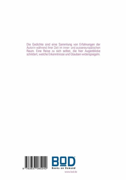 Die Gedichte sind eine Sammlung von Erfahrungen der Autorin während ihrer Zeit im inner- und aussereuropäischen Raum. Eine Reise zu sich selbst, die hier Augenblicke schildert, welche Erkenntnisse und Glauben widerspiegeln.