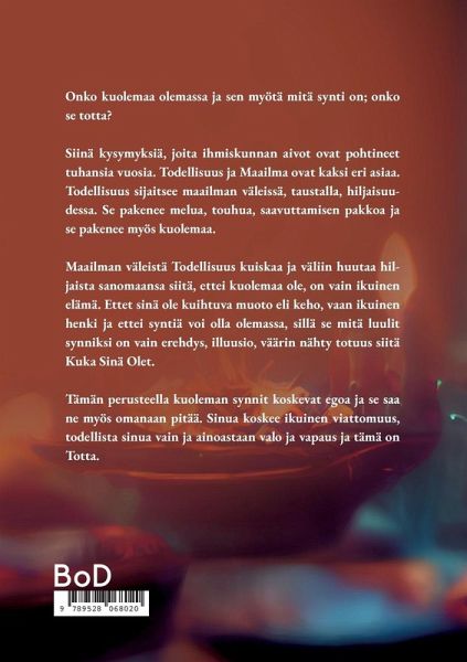 Onko kuolemaa olemassa ja sen myötä mitä synti on, onko se totta? Siinä kysymyksiä, joita ihmiskunnan aivot ovat pohtineet tuhansia vuosia. Todellisuus ja Maailma ovat kaksi eri asiaa. Todellisuus sijaitsee maailman väleissä, taustalla, hiljaisuudessa. Se pakenee melua, touhua, saavuttamisen pakkoa ja se pakenee myös kuolemaa. Maailman väleistä Todellisuus kuiskaa ja väliin huutaa hiljaista sanomaansa siitä, ettei kuolemaa ole, on vain ikuinen elämä. Ettet sinä ole kuihtuva muoto eli keho, vaan ikuinen henki ja ettei syntiä voi olla olemassa, sillä se mitä luulit synniksi on vain erehdys, illuusio, väärin nähty totuus siitä Kuka Sinä Olet. Tämän perusteella kuoleman synnit koskevat egoa ja se saa ne myös omanaan pitää. Sinua koskee ikuinen viattomuus, todellista sinua vain ja ainoastaan valo ja vapaus ja tämä on Totta.