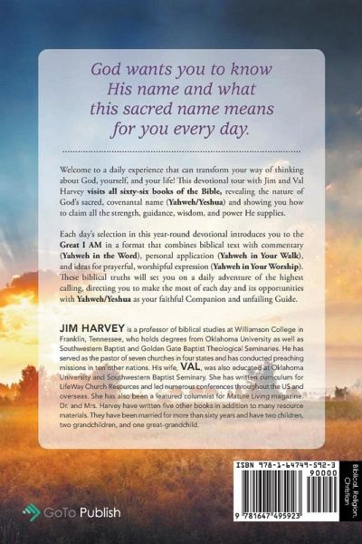 Welcome to a daily experience that can transform your way of thinking about God, yourself, and your life! This devotional tour with Jim and Val Harvey visits all sixty-six books of the Bible, revealing the nature of God's sacred, covenantal name (Yahweh/Yeshua) and showing you how to claim all the strength, guidance, wisdom, and power He supplies. Each day's selection in this year-round devotional introduces you to the Great I AM in a format that combines biblical text with commentary (Yahweh in the Word), personal application (Yahweh in Your Walk), and ideas for prayerful, worshipful expression (Yahweh in your Worship). These biblical truths will set you on a daily adventure of the highest calling, directing you to make the most of each day and its opportunities with Yahweh/Yeshua as your faithful Companion and unfailing Guide.