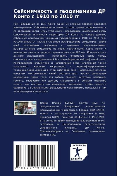 Pri nablüdenii za D.R. Kongo odnoj iz glawnyh problem qwlqütsq zemletrqseniq. Sejsmicheskaq aktiwnost' ätoj strany sosredotochena w ee wostochnoj chasti. Cel' ätoj knigi - predlozhit' komplexnuü shemu sejsmicheskoj aktiwnosti territorii DR Kongo na osnowe dannyh, sobrannyh neskol'kimi nauchnymi uchrezhdeniqmi s 1910 po 2010 god. Rassmatriwaütsq prostranstwennoe raspredelenie äpicentrow, shema osej naprqzhenij, swqzannyh s krupnymi zemletrqseniqmi, rasprostranenie äpicentrow na nowoj sejsmicheskoj karte Kongo i mehanizmy ochagow w predelah kratona Kongo za 100 let. Konechnaq cel' dannogo issledowaniq - prosledit' ochewidnuü swqz' mezhdu sejsmichnost'ü i geodinamikoj Vostochno-Afrikanskoj riftowoj zony. Raspredelenie äpicentrow i naprawleniq osej naprqzhenij takzhe pokazywaüt horoshuü korrelqciü s identificirowannymi tektonicheskimi liniqmi w ätoj riftowoj zone. Normal'nye razlomy osnownyh tektonicheskih linij sootwetstwuüt chastqm fokal'nyh mehanizmow. Krome togo, äta rabota pomozhet chitatelü, naprimer, geologu, geofiziku ili drugomu specialistu w oblasti geologii, ponqt', kak postroit' chat fokal'nogo mehanizma, chtoby prowesti srawnenie s wychislennymi fokal'nymi mehanizmami, poskol'ku w nih ne ispol'zuetsq shtrihowka.