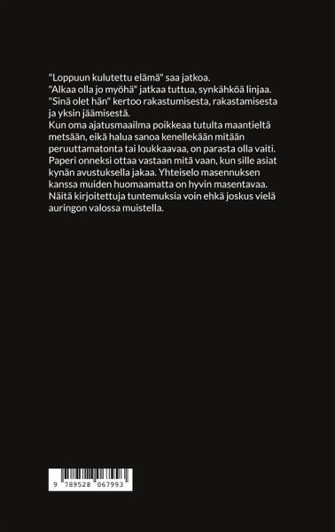"Loppuun kulutettu elämä" saa jatkoa. "Alkaa olla jo myöhä" jatkaa tuttua linjaa. "Sinä olet hän" kertoo rakastumisesta, rakastamisesta ja niiden loppumisesta. Kun oma ajatusmaailma poikkeaa tutulta maantieltä metsään, eikä halua sanoa kenellekään mitään peruuttamatonta tai loukkaavaa, on parasta olla vaiti. Paperi onneksi ottaa vastaan mitä vaan, kun sille asiat kynän avustuksella jakaa. Yhteiselo masennuksen kanssa muiden huomaamatta on hyvin masentavaa. Näitä kirjoitettuja tuntemuksia voin ehkä joskus vielä auringon valossa muistella.