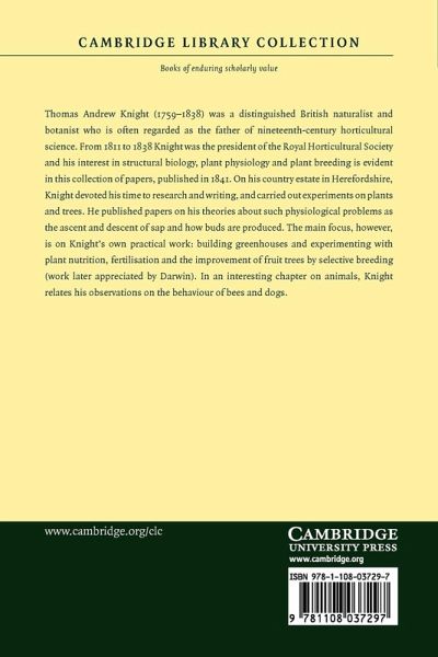 Thomas Andrew Knight (1759-1838) was a distinguished British naturalist and botanist who is often regarded as the father of nineteenth-century horticultural science. From 1811 to 1838 Knight was the president of the Royal Horticultural Society and his interest in structural biology, plant physiology and plant breeding is evident in this collection of papers, published in 1841. On his country estate in Herefordshire, Knight devoted his time to research and writing, and carried out experiments on plants and trees. He published papers on his theories about such physiological problems as the ascent and descent of sap and how buds are produced. The main focus, however, is on Knight's own practical work: building greenhouses and experimenting with plant nutrition, fertilisation and the improvement of fruit trees by selective breeding (work later appreciated by Darwin). In an interesting chapter on animals, Knight relates his observations on the behaviour of bees and dogs.
