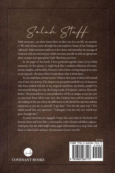 Selah moments...are those times when we don't just live our life, we examine it. We read certain events through the contemplative lenses of our God-given reflectacles. Selah moments enable us to slow down and internalize the message of Scripture with our internal eyes. Selah moments provide us with an appropriate place to pause and appropriate God's Word into our lives. In the pages of this book, I have gathered together some of my Selah moments. At first glance, it might look like a random collection of stories, poems, insights, and homilies. However, each of these writings began as an entry in my journal--the place where I write about what I think about. As you read these journal entries, I believe that some of them will remind you of your own journey. The chapters are grouped around the cast of characters who have walked with me in my original road show: my family, people I've encountered along the way, the living words of Scripture, and my Heavenly Father. The personalities in your production will be as unique as you are, just as your story lines will be your own. But I believe there will be moments in the reading of this text where the differences in the details become less and less important as you say to yourself, "I get that," "I've felt the same way," "I've asked myself that very question," "I thought I was the only one who'd ever gone through that." As your emotions are engaged, I hope that your time in this book will become more and more like a conversation with a friend and fellow pilgrim. And I pray that the Selah Stuff in these pages will remind you to stop, look, and listen to what God is saying in the moments of your own life.