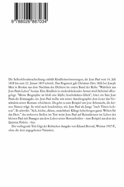 Die Selberlebensbeschreibung enthält Kindheitserinnerungen, die Jean Paul vom 14. Juli 1818 bis zum 22. Januar 1819 schrieb. Das Fragment gab Christian Otto 1826 bei Joseph Max in Breslau aus dem Nachlass des Dichters im ersten Band der Reihe "Wahrheit aus Jean Pauls Leben" heraus. Eine Kindheit in niederdrückender Armut wird lächelnd offengelegt. "Meine Biographie ist bloß eine Idylle; beschränktes Glück", leitet ein Satz Jean Pauls die Erstausgabe ein. Jean Paul wollte mit seiner Autobiographie dem Leser das Verständnis seiner Romane erleichtern. Da geht es zum Beispiel um jene Sehnsucht, die keinen Namen trägt. So wird auch beschrieben, wie Jean Paul als Junge "nach Tönen lechzete". Er schreibt: "Ach, leichte, dünne, unsichtbare Klänge beherbergen ganze Welten für das Herz." An mehreren Stellen im Text weist Jean Paul auf Koinzidenzen im Leben des kleinen Paul mit Passagen aus dem Leben seiner Romanhelden - zum Beispiel aus dem des Quintus Fixlein - hin. Der vorliegende Text folgt der Kritischen Ausgabe von Eduard Berend, Weimar 1927 ff., ohne die dort angegebenen Varianten.