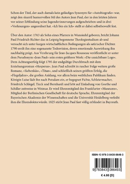 Schon der Titel, der auch damals kein geläufiges Synonym für "Autobiografie" war, zeigt den skurril humorvollen Stil des Autors Jean Paul, der in den letzten Jahren vor seiner Erblindung seine Jugenderinnerungen aufgeschrieben und in drei "Vorlesungen" angeordnet hat. "Ich bin ein Ich" stellt er dabei selbstbewußt fest.