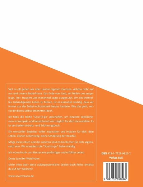 Viel zu oft gehen wir über unsere eigenen Grenzen. Achten nicht auf uns und unsere Bedürfnisse. Das Ende vom Lied, wir fühlen uns ausgelaugt, leer, frustiert und manchmal sogar ausgenutzt. Um ein kraftvolles, befriedigendes Leben zu führen, ist es essentiell wichtig, dass wir immer aus der Selbst-Achtsamkeit heraus handeln.Wie das geht, verrät dir dieses Selbst-Erkenntnis-Buch.Ich habe die Reihe "Soul-to-go" geschaffen, um einzelne Seelenthemen so kompalt und bereichernd wie möglich für dich darzustellen. Es ist ein Seelen-Arbeits- und Erfahrungsbuch.Ein wertvoller Begleiter voller Inspiration und Impulse für dich, dein Leben, deinen Lebensweg, deine Schöpfung der Realität.Mögen dieses Buch und die anderen Soul-to-Go Bücher für dich segensreich sein.Ich wünsche dir von Herzen ein großartiges und erfülltes Leben.Deine Jennifer WeidmannWir erweitern die "Soul-to-go" Reihe ständig.Mehr Infos über diese außergewöhnliche Seelen-Buch-Reihe erhältst du auf der Webseite www.urvertrauen.de