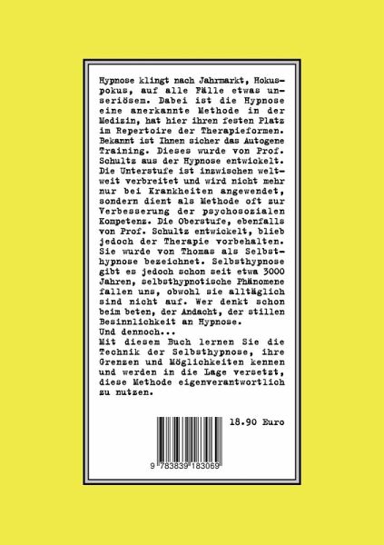 Hypnose klingt nach Jahrmarkt, Hokuspokus, auf alle Fälle nach etwas unseriösem. Dabei ist die Hypnose eine anerkannte Methode in der Medizin, hat hier ihren festen Platz im Repertoire der Therapieformen. Bekannt ist Ihnen sicher das Autogene Training, das von Prof. J.H. Schultz aus der Hypnose entwickelt wurde. Die Oberstufe des AT wurde später als Selbsthypnose bezeichnet. Diese gibt es jedoch schon seit etwa 3000 Jahren. Mit diesem Buch lernen Sie, aufbauend auf dem AT die Technik der Selbsthypnose, die weit über die Möglichkeiten des AT hinausgeht. Sie werden in die Lage versetzt, diese Methode zu erlernen und eigenverantwortlich zu nutzen.