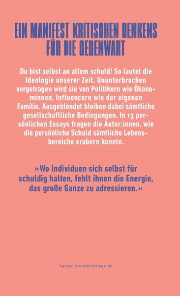 "Du bist selbst schuld an deinem Unglück!" Ein Einspruch gegen das neoliberale Mantra und ein Manifest kritischen DenkensDu bist überfordert, weil du deine Zeit nicht richtig planst. Du verdienst nicht genug Geld, weil du nicht hart genug arbeitest. Du bist verantwortlich für die Klimakatastrophe, weil du die Joghurtbecher nicht richtig entsorgst. Kurzum: Du bist selbst an allem schuld! So lautet die Ideologie unserer Zeit. Vorgetragen wird sie von Politikern wie Ökonominnen, Influencern wie der eigenen Familie. Ausgeblendet werden dabei sämtliche gesellschaftlichen Bedingungen. In 13 persönlichen Essays fragen die Autor:innen, wie die persönliche Schuld sämtliche Lebensbereiche erobern konnte. Ihr Buch leistet sich den Luxus des Zweifels am scheinbar Selbstverständlichen. Es ist ein Manifest kritischen Denkens für die Gegenwart.Mit Beiträgen von Christian Baron, Dietmar Dath, Aladin El-Mafaalani, Sebastian Friedrich, Sarah-Lee Heinrich, Özge Inan, Seyda Kurt, Sophie Lewis, Maximilian Pichl, Anke Stelling, Wolfgang M. Schmitt, Ann-Kristin Tlusty und Matthias Ubl.