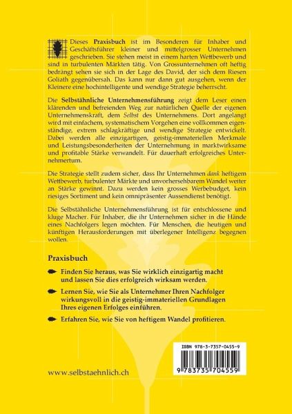 Dieses Buch zeigt, wie man das ganze Unternehmen als eine einzigartige, selbstähnliche Marke führen kann. Es ist ein Arbeits- und Praxisbuch. Es beginnt mit einer kurzen Einführung in den Aufbau eines Unternehmens als Marke. Anschliessend folgen acht Arbeitskapitel mit jeweils 20 - 30 Arbeitsfragen. Sie weisen den Weg zu einem Unternehmen, welches vom Markt als einzigartig wahrgenommen wird. Der Leser erhält schlussendlich ein Cockpit, mit dessen Hilfe er sein Unternehmen dauerhaft einzigartig und profitabel führen kann.Das Buch ist auch sehr gut geeignet für Unternehmensinhaber, die die wahren Erfolgsursachen einem Nachfolger bekannt machen möchten.Dieses Praxisbuch ist im Besonderen für Inhaber und Geschäftsführer kleiner und mitelgrosser Unternehmen geschrieben. Sie stehen meist in einem harten Wettbewerb und sind in turbulenten Märkten tätig. Von Grossunternehmen oft heftig bedrängt sehen sie sich in der Lage des David, der sich dem Riesen Goliath gegenübersah. Das kann nur dann gut ausgehen, wenn der Kleinere eine hochintelligente und wendige Strategie beherrscht. Die Selbstähnliche Unternehmensführung zeigt dem Leser einen klärenden und befreienden Weg zur natürlichen Quelle der eigenen Unternehmenskraft, dem Selbst des Unternehmens. Dort angelangt wird mit einfachem, systematischem Vorgehen eine vollkommen eigenständige, extrem schlagkräftige und wendige Strategie entwickelt. Dabei werden alle einzigartigen, geistig-immateriellen Merkmale und Leistungsbesonderheiten der Unternehmung in marktwirksame und pro?table Stärke verwandelt. Für dauerhaft erfolgreiches Unternehmertum. Die Strategie stellt zudem sicher, dass Ihr Unternehmen dank heftigem Wettbwerb, turbulenter Märkte und unvorhersehbarem Wandel weiter an Stärke gewinnt. Dazu werden kein grosses Werbebudget, kein riesiges Sortiment und kein omnipräsenter Aussendienst benötigt. Die Selbstähnliche Unternehmensführung ist für entschlossene und kluge Macher. Für Inhaber, die ihr Unternehmen sicher in die Hände eines Nachfolgers legen möchten. Für Menschen, die heutigen und künftigen Herausforderungen mit überlegener Intelligenz begegnen wollen.
