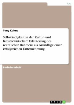 Bachelorarbeit aus dem Jahr 2015 im Fachbereich Jura - Zivilrecht / Handelsrecht, Gesellschaftsrecht, Kartellrecht, Wirtschaftsrecht, Note: 2,0, Hochschule Schmalkalden, ehem. Fachhochschule Schmalkalden, Sprache: Deutsch, Abstract: Die Branche der Kultur- und Kreativwirtschaft, welche zu 97 Prozent von kleinen und Kleinstunternehmen geprägt ist, funktioniert oft anders als klassische Wirtschaftsbranchen. Sie ist zwar überdurchschnittlich wachstumsstark und hochgradig innovativ, jedoch arbeiten die Kultur- und Kreativschaffenden vielfach mit Methoden und Denkansätzen, welche nicht mit den damals bestandenen und immer noch bestehenden Förderstrukturen korrelieren. Ein Grund dafür ist, weil die unternehmerische Aktivität der Kultur- und Kreativschaffenden offen und unvoreingenommen geschieht. Dabei fehlt es oftmals an unternehmerischem Know-How aber auch und vor allem an juristischem Hintergrundwissen, welches neben der Kreativität die Qualifizierung ausmacht, eine Unternehmung inder Kultur- und Kreativwirtschaft vom Grundstein der Idee, bis zum Umsatz generierenden Unternehmen, erfolgreich zu gründen und leiten. Diese Arbeit soll diesen weniger kreativen - dafür umso wichtigeren Aspekt, einer gut durchdachten rechtlichen Herangehensweise für eine erfolgreiche Unternehmensgründung in der Kultur- und Kreativwirtschaft aufgreifen und als "Mittlerfunktion" in Gestalt einer Ratgeberbroschüre dienen.