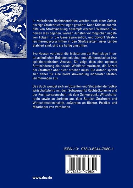 Eva Heesen verbindet die Erläuterung der Rechtslage in unterschiedlichen Gebieten mit einer modelltheoretischen bzw. spieltheoretischen Analyse. Sie zeigt, dass eine optimale Strafminderung die soziale Wohlfahrt maximiert, die Anzahl der Straftaten aber nicht erhöhen muss. Die Autorin spricht sich daher für eine breite Anwendung moderater Straferleichterungen aus.
