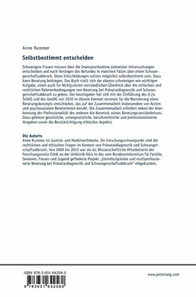 Schwangere Frauen müssen über die Inanspruchnahme pränataler Untersuchungen entscheiden und nach Vorliegen des Befundes in manchen Fällen über einen Schwangerschaftsabbruch. Diese Entscheidungen sollten möglichst selbstbestimmt sein. Dazu kann Beratung beitragen. Das Buch stellt sich der ebenso schwierigen wie wichtigen Aufgabe, einen auch für Nichtjuristen verständlichen Überblick über die ethischen und rechtlichen Rahmenbedingungen von Beratung bei Pränataldiagnostik und Schwangerschaftsabbruch zu geben. Der Gesetzgeber hat sich mit der Einführung des