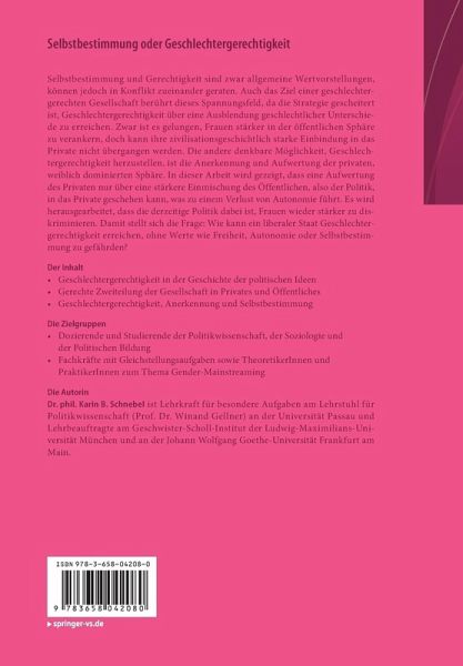 Selbstbestimmung und Gerechtigkeit sind zwar allgemeine Wertvorstellungen, die jedoch in Konflikt zueinander geraten können. Auch das Ziel einer geschlechtergerechten Gesellschaft berührt dieses Spannungsfeld, da die Strategie gescheitert ist, Geschlechtergerechtigkeit über eine Ausblendung geschlechtlicher Unterschiede zu erreichen. Zwar ist es gelungen, Frauen stärker in der öffentlichen Sphäre zu verankern, doch kann ihre zivilisationsgeschichtlich starke Einbindung in das Private nicht übergangen werden. Die andere denkbare Möglichkeit Geschlechtergerechtigkeit herzustellen, ist die Anerkennung und Aufwertung der privaten, weiblich dominierten Sphäre. Hier wird gezeigt, dass eine Aufwertung des Privaten nur über eine stärkere Einmischung des Öffentlichen, also der Politik, in das Private geschehen kann, was zu einem Verlust von Autonomie führt. Es wird herausgearbeitet, dass die derzeitige Politik dabei ist, Frauen wieder stärker zu diskriminieren. Damit stellt sich die Frage: Wie kann ein liberaler Staat Geschlechtergerechtigkeit erreichen, ohne Werte wie Freiheit, Autonomie oder Selbstbestimmung zu gefährden?