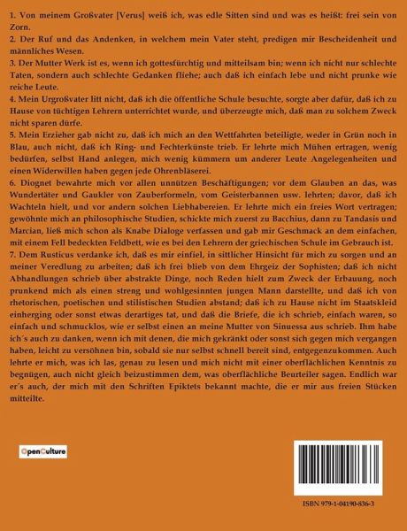 1. Von meinem Großvater [Verus] weiß ich, was edle Sitten sind und was es heißt: frei sein von Zorn. 2. Der Ruf und das Andenken, in welchem mein Vater steht, predigen mir Bescheidenheit und männliches Wesen. 3. Der Mutter Werk ist es, wenn ich gottesfürchtig und mitteilsam bin; wenn ich nicht nur schlechte Taten, sondern auch schlechte Gedanken fliehe; auch daß ich einfach lebe und nicht prunke wie reiche Leute. 4. Mein Urgroßvater litt nicht, daß ich die öffentliche Schule besuchte, sorgte aber dafür, daß ich zu Hause von tüchtigen Lehrern unterrichtet wurde, und überzeugte mich, daß man zu solchem Zweck nicht sparen dürfe. 5. Mein Erzieher gab nicht zu, daß ich mich an den Wettfahrten beteiligte, weder in Grün noch in Blau, auch nicht, daß ich Ring- und Fechterkünste trieb. Er lehrte mich Mühen ertragen, wenig bedürfen, selbst Hand anlegen, mich wenig kümmern um anderer Leute Angelegenheiten und einen Widerwillen haben gegen jede Ohrenbläserei. 6. Diognet bewahrte mich vor allen unnützen Beschäftigungen; vor dem Glauben an das, was Wundertäter und Gaukler von Zauberformeln, vom Geisterbannen usw. lehrten; davor, daß ich Wachteln hielt, und vor andern solchen Liebhabereien. Er lehrte mich ein freies Wort vertragen; gewöhnte mich an philosophische Studien, schickte mich zuerst zu Bacchius, dann zu Tandasis und Marcian, ließ mich schon als Knabe Dialoge verfassen und gab mir Geschmack an dem einfachen, mit einem Fell bedeckten Feldbett, wie es bei den Lehrern der griechischen Schule im Gebrauch ist. 7. Dem Rusticus verdanke ich, daß es mir einfiel, in sittlicher Hinsicht für mich zu sorgen und an meiner Veredlung zu arbeiten; daß ich frei blieb von dem Ehrgeiz der Sophisten; daß ich nicht Abhandlungen schrieb über abstrakte Dinge, noch Reden hielt zum Zweck der Erbauung, noch prunkend mich als einen streng und wohlgesinnten jungen Mann darstellte, und daß ich von rhetorischen, poetischen und stilistischen Studien abstand; daß ich zu Hause nicht im Staatskleid einherging oder sonst etwas derartiges tat, und daß die Briefe, die ich schrieb, einfach waren, so einfach und schmucklos, wie er selbst einen an meine Mutter von Sinuessa aus schrieb. Ihm habe ich¿s auch zu danken, wenn ich mit denen, die mich gekränkt oder sonst sich gegen mich vergangen haben, leicht zu versöhnen bin, sobald sie nur selbst schnell bereit sind, entgegenzukommen. Auch lehrte er mich, was ich las, genau zu lesen und mich nicht mit einer oberflächlichen Kenntnis zu begnügen, auch nicht gleich beizustimmen dem, was oberflächliche Beurteiler sagen. Endlich war er¿s auch, der mich mit den Schriften Epiktets bekannt machte, die er mir aus freien Stücken mitteilte.