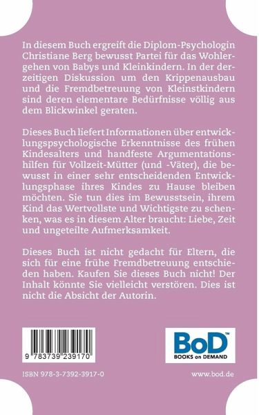 In diesem Buch ergreift die Diplom-Psychologin Christiane Berg bewusst Partei für das Wohlergehen von Babys und Kleinkindern. In der derzeitigen Diskussion um den Krippenausbau und die Fremdbetreuung von Kleinstkindern sind deren elementare Bedürfnisse völlig aus dem Blickwinkel geraten.Dieses Buch liefert Informationen über entwicklungspsychologische Erkenntnisse des frühen Kindesalters und handfeste Argumentationshilfen für Vollzeit-Mütter (und -Väter), die bewusst in einer sehr entscheidenden Entwicklungsphase ihres Kindes zu Hause bleiben möchten. Sie tun dies im Bewusstsein, ihrem Kind das Wertvollste und Wichtigste zu schenken, was es in diesem Alter braucht: Liebe, Zeit und ungeteilte Aufmerksamkeit. Dieses Buch ist nicht gedacht für Eltern, die sich für eine frühe Fremdbetreuung entschieden haben. Kaufen Sie dieses Buch nicht! Der Inhalt könnte Sie vielleicht verstören. Dies ist nicht die Absicht der Autorin.