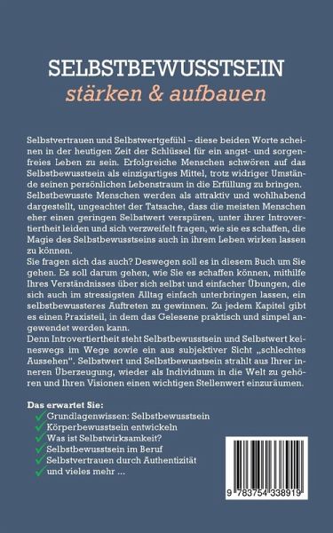 Selbstvertrauen und Selbstwertgefühl - diese beiden Worte scheinen in der heutigen Zeit der Schlüssel für ein angst- und sorgenfreies Leben zu sein. Erfolgreiche Menschen schwören auf das Selbstbewusstsein als einzigartiges Mittel, trotz widriger Umstände seinen persönlichen Lebenstraum in die Erfüllung zu bringen. Selbstbewusste Menschen werden als attraktiv und wohlhabend dargestellt, ungeachtet der Tatsache, dass die meisten Menschen eher einen geringen Selbstwert verspüren, unter ihrer Introvertiertheit leiden und sich verzweifelt fragen, wie sie es schaffen, die Magie des Selbstbewusstseins auch in ihrem Leben wirken lassen zu können.Sie fragen sich das auch? Deswegen soll es in diesem Buch um Sie gehen. Es soll darum gehen, wie Sie es schaffen können, mithilfe Ihres Verständnisses über sich selbst und einfacher Übungen, die sich auch im stressigsten Alltag einfach unterbringen lassen, ein selbstbewussteres Auftreten zu gewinnen. Zu jedem Kapitel gibt es einen Praxisteil, indem das Gelesene praktisch und simpel angewendet werden kann.Denn Introvertiertheit steht Selbstbewusstsein und Selbstwert keineswegs im Wege sowie ein aus subjektiver Sicht ,,schlechtes Aussehen''. Selbstwert und Selbstbewusstsein strahlt aus Ihrer inneren Überzeugung, wieder als Individuum in die Welt zu gehören und Ihren Visionen einen wichtigen Stellenwert einzuräumen.Das erwartet Sie:-Grundlagenwissen: Selbstbewusstsein-Körperbewusstsein entwickeln-Was ist Selbstwirksamkeit?-Selbstbewusstsein im Beruf-Selbstvertrauen durch Authentizität-und vieles mehr ...