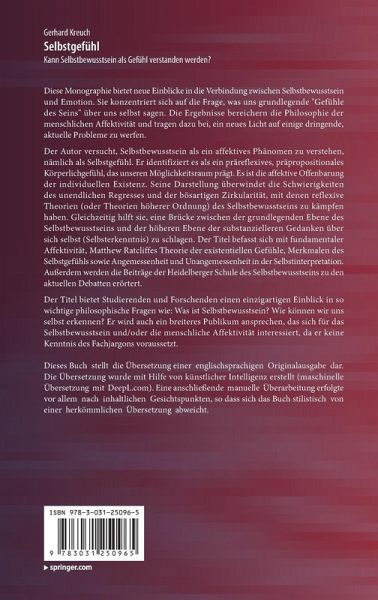Der Autor versucht, das Selbstbewusstsein als ein affektives Phänomen zu verstehen, nämlich als Selbstgefühl. Er identifiziert es als ein präreflexives, präpropositionales, körperliches Gefühl, das unseren Möglichkeitsraum formt. Es ist die affektive Offenlegung der individuellen Existenz. Seine Darstellung überwindet die Schwierigkeiten des unendlichen Regresses und der bösartigen Zirkularität, mit denen reflexive (oder übergeordnete) Darstellungen des Selbstbewusstseins zu kämpfen haben. Gleichzeitig hilft sie, eine Brücke zwischen der grundlegenden Ebene des Selbstbewusstseins und der höheren Ebene der substanzielleren Gedanken über sich selbst zu schlagen. Der Titel befasst sich mit grundlegender Affektivität, Matthew Ratcliffes Theorie der existentiellen Gefühle, Merkmalen des Selbstgefühls sowie Angemessenheit und Unangemessenheit in der Selbstinterpretation. Außerdem werden die Beiträge der Heidelberger Schule des Selbstbewusstseins zu den aktuellen Debatten erörtert.