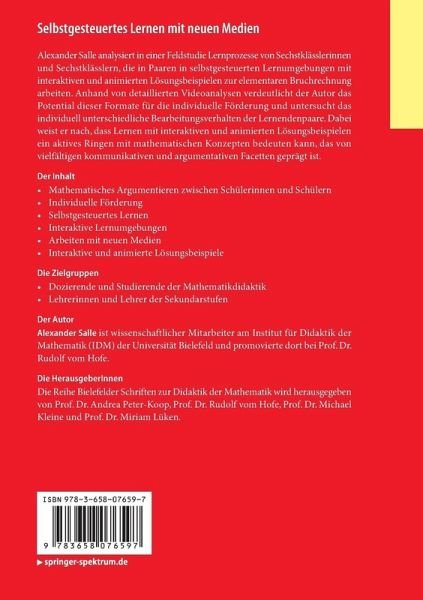 Alexander Salle analysiert in einer Feldstudie Lernprozesse von Sechstklässlerinnen und Sechstklässlern, die in Paaren in selbstgesteuerten Lernumgebungen mit interaktiven und animierten Lösungsbeispielen zur elementaren Bruchrechnung arbeiten. Anhand von detaillierten Videoanalysen verdeutlicht der Autor das Potential dieser Formate für die individuelle Förderung und untersucht das individuell unterschiedliche Bearbeitungsverhalten der Lernendenpaare. Dabei weist er nach, dass Lernen mit interaktiven und animierten Lösungsbeispielen ein aktives Ringen mit mathematischen Konzepten bedeuten kann, das von vielfältigen kommunikativen und argumentativen Facetten geprägt ist.