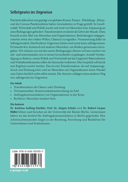 Das letzte Jahrzehnt war geprägt von globalen Krisen: Finanz-, Flüchtlings-, Klima- und die Corona-Pandemiekrise haben Gewissheiten in Frage gestellt. In Gesellschaft, Wirtschaft und Politik wurde und wird von Menschen eine Anpassung an neue Bedingungen gefordert. Transformation erscheint als Gebot der Stunde. Dazu braucht es den Mut von Menschen und Organisationen, Bedrohungen entgegenzutreten sowie den vitalen Willen, Chancen zu ergreifen. Voraussetzung dafür ist Selbstgewissheit. Das Problem: Ungewisse Zeiten sind meist keine selbstgewissen. Es braucht den Austausch mit anderen Menschen, um Risiken gemeinsam einzugehen. Wir müssen uns mit den neuen Bedingungen ebenso vertraut machen wie mit- und untereinander, um zu neuen Gewissheiten zu gelangen. Anstatt Verständigung zu fördern, setzen Politik und Wirtschaft auf das Gegenteil: Paternalismus und Verhaltensökonomie sollen die Sinnsuche verkürzen. Das Gespräch soll durch sein Ergebnis ersetzt werden. Das ist eine Transformation, die auf Anpassungsdruck und Drohung setzt, weil sie Menschen wie Organisationen einen Wandel zum Guten letztlich nicht selbst zutraut. Die Autoren schlagen einen anderen Weg vor: selbstgewiss ins Ungewisse.