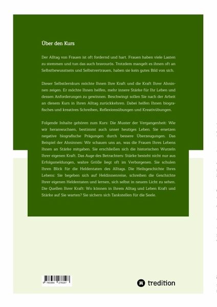 Der Alltag von Frauen ist oft fordernd und hart. Frauen haben viele Lasten zu stemmen und tun das auch bravourös. Trotzdem mangelt es ihnen oft an Selbstbewusstsein und Selbstvertrauen, haben sie kein gutes Bild von sich.Dieser Selbstlernkurs möchte Ihnen Ihre Kraft und die Kraft Ihrer Ahninnen zeigen. Er möchte Ihnen helfen, mehr innere Stärke für Ihr Leben und dessen Anforderungen zu gewinnen. Beschwingt sollen Sie nach der Arbeit an diesem Kurs in Ihren Alltag zurückkehren. Dabei helfen Ihnen biografisches und kreatives Schreiben, Reflexionsübungen und Kreativübungen.Folgende Inhalte gehören zum Kurs: Die Muster der Vergangenheit: Wie wir heranwuchsen, bestimmt auch unser heutiges Leben. Sie ersetzen negative biografische Prägungen durch bessere Überzeugungen. Das Beispiel der Ahninnen: Wir schauen uns an, was die Frauen Ihres Lebens Ihnen an Stärke mitgaben. Sie erschließen sich die historischen Wurzeln Ihrer eigenen Kraft. Das Auge des Betrachters: Stärke besteht nicht nur aus Erfolgsmeldungen, wahre Größe liegt oft im Verborgenen. Sie schulen Ihren Blick für die Heldentaten des Alltags. Die Heilsgeschichte Ihres Lebens: Sie begeben sich auf Heldinnenreise, schreiben die Geschichte Ihrer eigenen Heldentaten und lernen, sich selbst in neuem Licht zu sehen. Die Quellen Ihrer Kraft: Wo können in Ihrem Alltag und Leben Kraft und Stärke auf Sie warten? Sie sichern sich Tankstellen für die Seele.