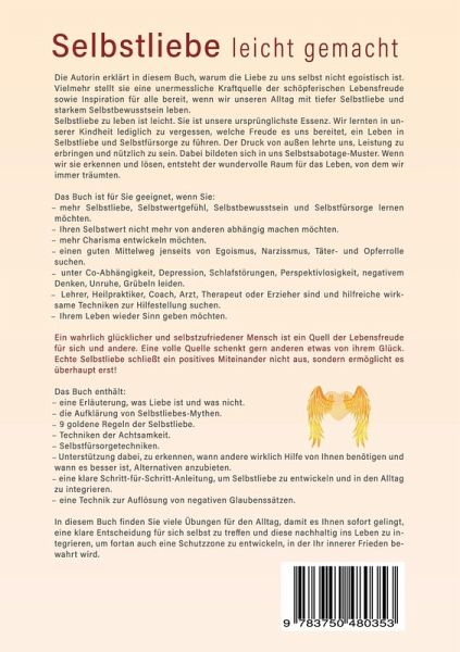 Die Autorin erklärt in diesem Buch, warum die Liebe zu uns selbst nicht egoistisch ist. Vielmehr stellt sie eine unermessliche Kraftquelle der schöpferischen Lebensfreude sowie Inspiration für alle bereit, wenn wir unseren Alltag mit tiefer Selbstliebe und starkem Selbstbewusstsein leben.Selbstliebe zu leben ist leicht. Sie ist unsere ursprünglichste Essenz. Wir lernten in unserer Kindheit lediglich zu vergessen, welche Freude es uns bereitet, ein Leben in Selbstliebe und Selbstfürsorge zu führen. Der Druck von außen lehrte uns, Leistung zu erbringen und nützlich zu sein. Dabei bildeten sich in uns Selbstsabotage-Muster. Wenn wir sie erkennen und lösen, entsteht der wundervolle Raum für das Leben, von dem wir immer träumten.Das Buch ist für Sie geeignet, wenn Sie:- mehr Selbstliebe, Selbstwertgefühl, Selbstbewusstsein und Selbstfürsorge lernen möchten.- Ihren Selbstwert nicht mehr von anderen abhängig machen möchten.- mehr Charisma entwickeln möchten. - einen guten Mittelweg jenseits von Egoismus, Narzissmus, Täter- und Opferrolle suchen.- unter Co-Abhängigkeit, Depression, Schlafstörungen, Perspektivlosigkeit, negativem Denken, Unruhe, Grübeln leiden.- Lehrer, Heilpraktiker, Coach, Arzt, Therapeut oder Erzieher sind und hilfreiche wirksame Techniken zur Hilfestellung suchen.- Ihrem Leben wieder Sinn geben möchten.Ein wahrlich glücklicher und selbstzufriedener Mensch ist ein Quell der Lebensfreude für sich und andere. Eine volle Quelle schenkt gern anderen etwas von ihrem Glück. Echte Selbstliebe schließt ein positives Miteinander nicht aus, sondern ermöglicht es überhaupt erst!Das Buch enthält:- eine Erläuterung, was Liebe ist und was nicht.- die Aufklärung von Selbstliebes-Mythen.- 9 goldene Regeln der Selbstliebe.- Techniken der Achtsamkeit.- Selbstfürsorgetechniken.- Unterstützung dabei, zu erkennen, wann andere wirklich Hilfe von Ihnen benötigen und wann es besser ist, Alternativen anzubieten.- eine klare Schritt-für-Schritt-Anleitung, um Selbstliebezu entwickeln und in den Alltag zu integrieren.- eine Technik zur Auflösung von negativen Glaubenssätzen. In diesem Buch finden Sie viele Übungen für den Alltag, damit es Ihnen sofort gelingt, eine klare Entscheidung für sich selbst zu treffen und diese nachhaltig ins Leben zu integrieren, um fortan auch eine Schutzzone zu entwickeln, in der Ihr innerer Frieden bewahrt wird.