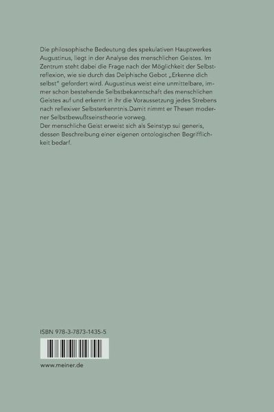 Die philosophische Bedeutung des spekulativen Hauptwerkes Augustinus¿ liegt in der Analyse des menschlichen Geistes. Im Zentrum steht dabei die Frage nach der Möglichkeit der Selbstreflexion, wie sie durch das Delphische Gebot: ¿Erkenne dich selbst¿ gefordert wird. Augustinus weist eine unmittelbare, immer schon bestehende Selbstbekanntschaft des menschlichen Geistes auf und erkennt in ihr die Voraussetzung jedes Strebens nach reflexiver Selbsterkenntnis.Damit nimmt er Thesen moderner Selbstbewußtseinstheorie vorweg. Der menschliche Geist erweist sich als Seinstyp sui generis, dessen Beschreibung einer eigenen ontologischen Begrifflichkeit bedarf.