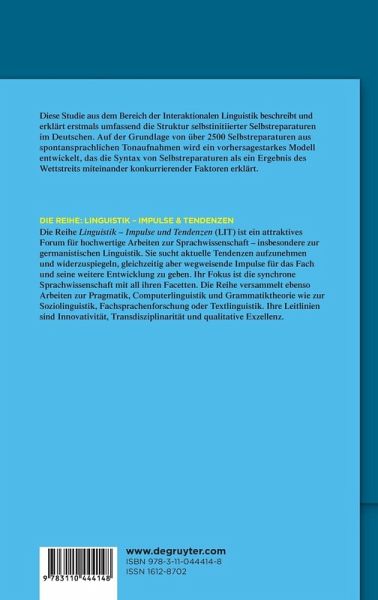 Diese Studie aus dem Bereich der Interaktionalen Linguistik beschreibt und erklärt erstmals umfassend die Struktur selbstinitiierter Selbstreparaturen im Deutschen. Auf der Grundlage von über 2500 Selbstreparaturen aus spontansprachlichen Tonaufnahmen wird ein Modell entwickelt, das die Syntax von Selbstreparaturen als ein Ergebnis des Wettstreits miteinander konkurrierender Faktoren erklärt. Dieses Modell, in dessen Zentrum das Streben der Sprecher nach einer möglichst schnellen Beseitigung des Reparandums steht, sagt die Position des Abbruchpunkts und des Retraktionspunkts vorher. Zudem werden weitere Aspekte der Selbstreparatur in die Analyse einbezogen: die Selbstreparaturmarker (z.B. äh), die Selbstreparaturoperationen (z.B. Substitution und Insertion) und die verschiedenen Typen von Reparanda.