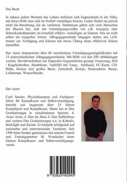 In nahezu jedem Moment des Lebens befinden sich Gegenstände in der Nähe, mit deren Hilfe man sich im Notfall verteidigen könnte. Leider finden sie jedoch nicht die Beachtung, die sie verdienen. Stattdessen geben sich viele Menschen der Illusion hin, sich mit Verteidigungswaffen wie z.B. Gasspray oder Schreckschußpistolen im Ernstfall effektiv verteidigen zu können. Das ist nicht selten ein tragischer Irrtum. Alltagsgegenstände hingegen stehen uns i.d.R. immer zur Verfügung und können mit etwas Übung einen effektiven Schutz darstellen.Der Autor demonstriert über 60 verschiedene Verteidigungsmöglichkeiten mit 15 unterschiedlichen Alltagsgegenständen. Mit Hilfe von fast 300 Abbildungen werden Abwehrtechniken mit folgenden Gegenständen gezeigt: Feuerzeug, Stift / Kugelschreiber, Haarbürste, Teelöffel mit Tasse, Schlüssel, EC-Karte, CD-Hülle, kleines und großes Buch, Zeitschrift, Knirps, Stockschirm, Besen, Luftpumpe, Wasserflasche.