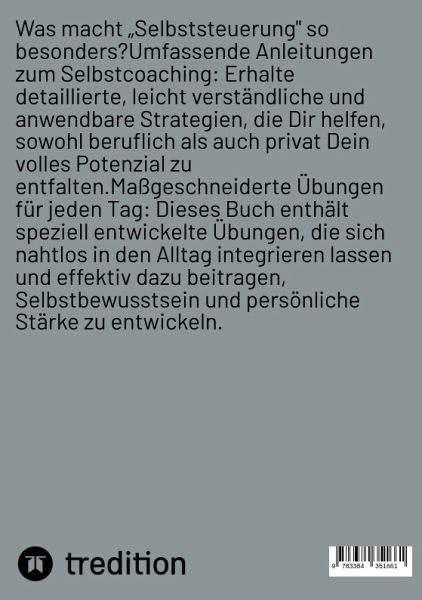 Was macht "Selbststeuerung" so besonders?Umfassende Anleitungen zum Selbstcoaching: Erhalte detaillierte, leicht verständliche und anwendbare Strategien, die Dir helfen, sowohl beruflich als auch privat Dein volles Potenzial zu entfalten.Maßgeschneiderte Übungen für jeden Tag: Dieses Buch enthält speziell entwickelte Übungen, die sich nahtlos in den Alltag integrieren lassen und effektiv dazu beitragen, Selbstbewusstsein und persönliche Stärke zu entwickeln.