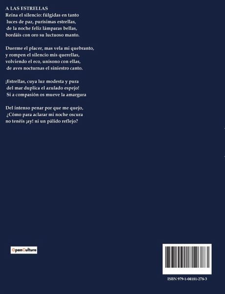 A LAS ESTRELLAS Reina el silencio: fúlgidas en tanto luces de paz, purísimas estrellas, de la noche feliz lámparas bellas, bordáis con oro su luctuoso manto. Duerme el placer, mas vela mi quebranto, y rompen el silencio mis querellas, volviendo el eco, unísono con ellas, de aves nocturnas el siniestro canto. ¡Estrellas, cuya luz modesta y pura del mar duplica el azulado espejo! Si a compasión os mueve la amargura Del intenso penar por que me quejo, ¿Cómo para aclarar mi noche oscura no tenéis ¡ay! ni un pálido reflejo?