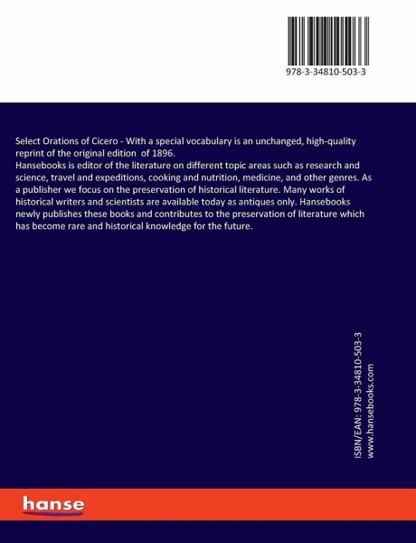 Select Orations of Cicero - With a special vocabulary is an unchanged, high-quality reprint of the original edition of 1896.Hansebooks is editor of the literature on different topic areas such as research and science, travel and expeditions, cooking and nutrition, medicine, and other genres. As a publisher we focus on the preservation of historical literature. Many works of historical writers and scientists are available today as antiques only. Hansebooks newly publishes these books and contributes to the preservation of literature which has become rare and historical knowledge for the future.