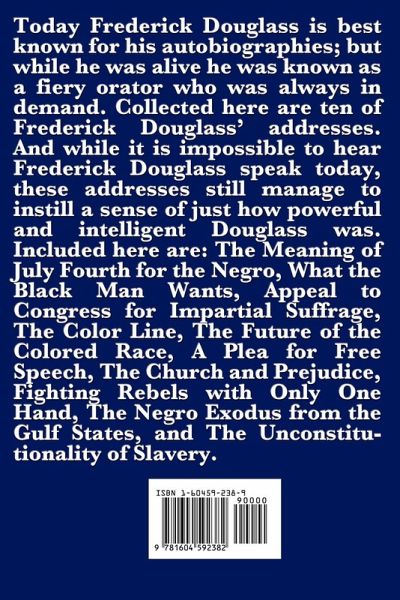 Today Frederick Douglass is best known for his autobiographies; but while he was alive he was known as a fiery orator who was always in demand. Collected here are ten of Frederick Douglass' addresses. And while it is impossible to hear Frederick Douglass speak today, these addresses still manage to instill a sense of just how powerful and intelligent Douglass was. Included here are: The Meaning of July Fourth for the Negro, What the Black Man Wants, Appeal to Congress for Impartial Suffrage, The Color Line, The Future of the Colored Race, A Plea for Free Speech, The Church and Prejudice, Fighting Rebels with Only One Hand, The Negro Exodus from the Gulf States, and The Unconstitutionality of Slavery.