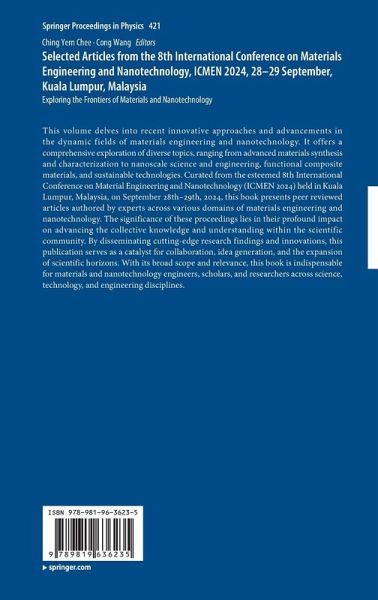 This volume delves into recent innovative approaches and advancements in the dynamic fields of materials engineering and nanotechnology. It offers a comprehensive exploration of diverse topics, ranging from advanced materials synthesis and characterization to nanoscale science and engineering, functional composite materials, and sustainable technologies. Curated from the esteemed 8th International Conference on Material Engineering and Nanotechnology (ICMEN 2024) held in Kuala Lumpur, Malaysia, on September 28th-29th, 2024, this book presents peer reviewed articles authored by experts across various domains of materials engineering and nanotechnology. The significance of these proceedings lies in their profound impact on advancing the collective knowledge and understanding within the scientific community. By disseminating cutting-edge research findings and innovations, this publication serves as a catalyst for collaboration, idea generation, and the expansion of scientific horizons. With its broad scope and relevance, this book is indispensable for materials and nanotechnology engineers, scholars, and researchers across science, technology, and engineering disciplines.