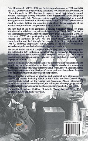 Peter Romanovsky (1892-1964) was Soviet chess champion in 1923 (outright) and 1927 (jointly with Bogatyrchuk). According to Chessmetrics he was ranked 12th in the world in 1925. Romanovsky was also one of Soviet chess's greatest teachers, standing at the very foundation of the Soviet Chess School. His pupils included Averbakh, Zak, Alatortsev, Lisitsin and many others, and he provided much guidance to Botvinnik in his early career. Author of 16 books, Romanovsky stood for active, fighting and objective chess where the requirements of the position took precedence over positional rules of thumb. The first half of this book comprises a detailed biography written by chess historian and world chess composition champion Sergei Tkachenko. Tkachenko tells the incredible story of a man who spent nearly a year as a captive in Germany at the start of WWI after participating in the Mannheim chess events of 1914, endured the hardships of Civil War and NEP Russia, won two Soviet championships and lived through the horrors of the Siege of Leningrad in 1941-42, suffering unspeakable family tragedy as he did so. Romanovsky narrowly escaped an early death on three separate occasions. The second half of this book comprises Romanovsky's own chess autobiography first published in 1954 in Russian, including 72 of his best games. His instructive annotations have been updated with computer analysis by IM Grigory Bogdanovich, an accomplished historian who published a biography of Bogoljubov in 2020. Because Romanovsky wrote this book after his career was over, its annotations are considerably more honest than those found in books that collate the annotations of great players made while their career was in full swing. Indeed, in several games Romanovsky comments how his views of certain positions changed over the years as he accumulated greater knowledge and experience. This book is also a textbook on attacking and positional play. Most games are classified by themes, including Attack on the Castled and Non-Castled King, Counterattack, Attack on the Center, and Queenside Attack. Moreover, it contains discussions on central control, the bishop pair advantage, pawn storms, simplification strategy, exchange sacrifices, king safety, and other key topics. His opponents include Alekhine, Botvinnik, Bogoljubov, Averbakh, Flohr, Levenfish, Kotov, and many other stars. Check out the publisher's website for special deals on this and other books!