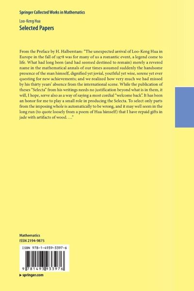 From the Preface by H. Halberstam: "The unexpected arrival of Loo-Keng Hua in Europe in the fall of 1978 was for many of us a romantic event, a legend come to life. What had long been (and had seemed destined to remain) merely a revered name in the mathematical annals of our times assumed suddenly the handsome presence of the man himself, dignified yet jovial, youthful yet wise, serene yet ever questing for new achievements; and we realized how very much we had missed by his thirty years' absence from the international scene. While the publication of theses "Selecta" from his writings needs no justification beyond what is in them, it will, I hope, serve also as a way of saying a most cordial "welcome back".It has been an honor for me to play a small role in producing the Selecta. To select only parts from the imposing whole is automatically to be wrong, and it may well seem in the long run (to quote loosely from a poem of Hua himself) that I have repaid gifts in jade with artifacts ofwood. ..."
