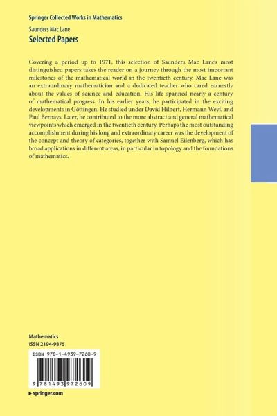 Covering a period up to 1971, this selection of Saunders Mac Lane's most distinguished papers takes the reader on a journey through the most important milestones of the mathematical world in the twentieth century. Mac Lane was an extraordinary mathematician and a dedicated teacher who cared earnestly about the values of science and education. His life spanned nearly a century of mathematical progress. In his earlier years, he participated in the exciting developments in Göttingen. He studied under David Hilbert, Hermann Weyl, and Paul Bernays. Later, he contributed to the more abstract and general mathematical viewpoints which emerged in the twentieth century. Perhaps the most outstanding accomplishment during his long and extraordinary career was the development of the concept and theory of categories, together with Samuel Eilenberg, which has broad applications in different areas, in particular in topology and the foundations of mathematics.