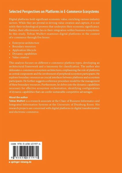Digital platforms hold significant economic value, enriching various industry sectors. While they are pivotal in driving value creation and capture, it is not solely their technological prowess that underpins their economic significance. Rather, their effectiveness lies in their integration within business ecosystems. In this study, Tobias Wulfert examines digital platforms in the context of e-commerce through five lenses: